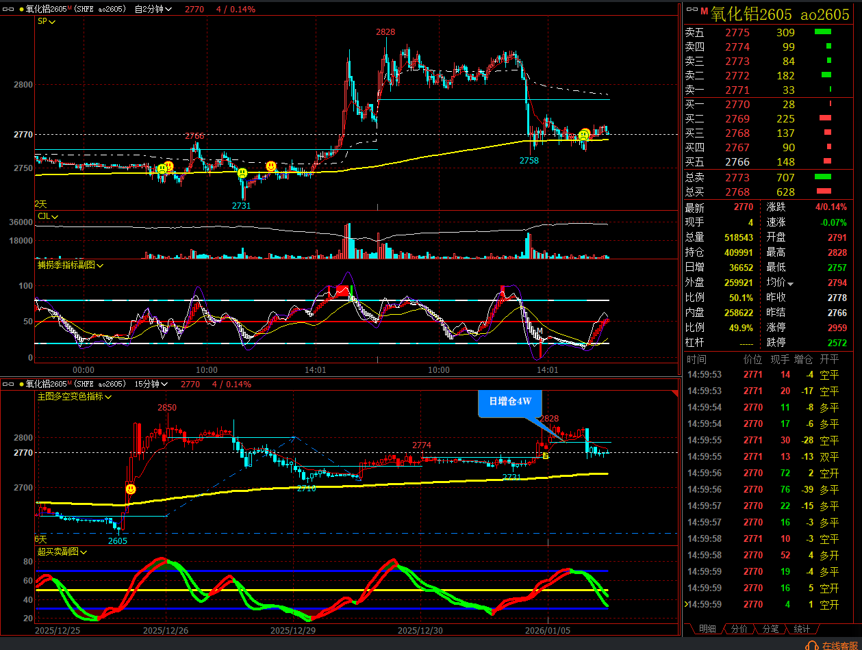 氧化铝2605:开盘后上行到2828 ,前高2850压力 下午急速下跌 最低2758 做了几跳反弹: